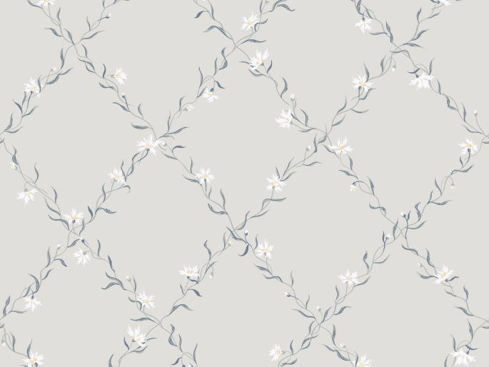 Ewa Grey is een behang met sierlijk handgeschilderde korenbloemslingers. In het Gustaviaanse tijdperk was de korenbloem een populaire snijbloem. Het patroon doet denken aan het witte en blauwe Chinese porselein van de Vereenigde Oostindische Compagnie, dat in de 18e eeuw high fashion was en sindsdien een tijdloze klassieker is.