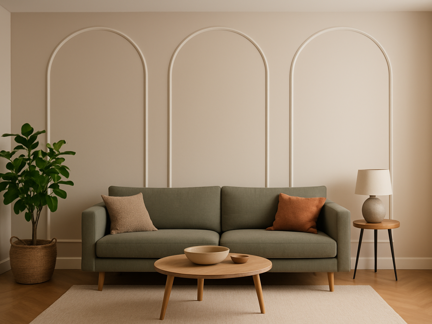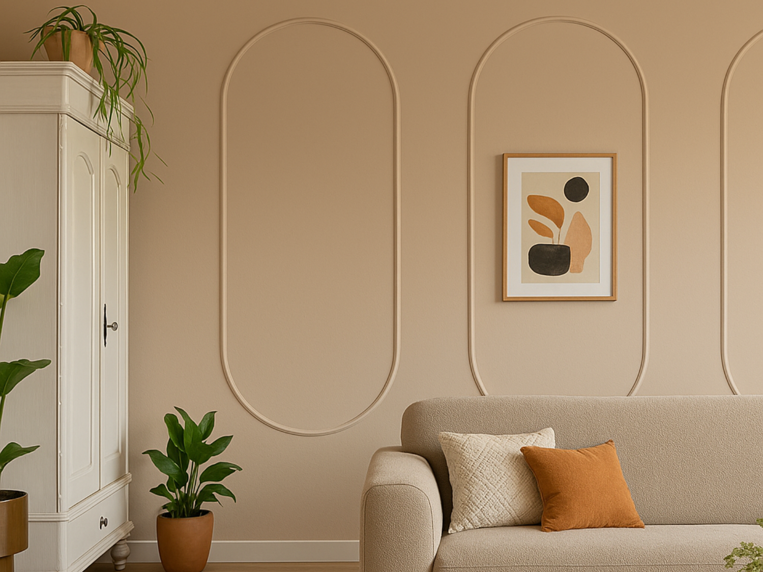 De wand in deze stijlvolle woonkamer is voorzien van elegante, verticale kaders met een afgeronde, ovale vorm aan de boven- en onderzijde. Deze zachte lijnen creëren een harmonieus en verfijnd patroon dat diepte en karakter toevoegt aan de ruimte. Voor het maken van deze bijzondere wanddecoratie is gebruikgemaakt van wandlijst PX209 en de flexibele wandlijst PX209F, waardoor de vloeiende rondingen perfect tot hun recht komen. De combinatie van strakke en gebogen lijnen zorgt voor een modern en tijdloos effect dat moeiteloos past binnen diverse interieurstijlen. Deze toepassing is niet voor niets de nummer 1 in de top 5 van populairste toepassingen met flexibele sierlijsten.