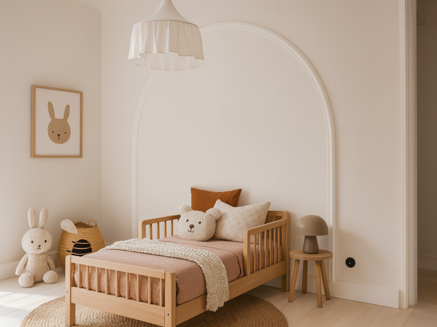 In deze sfeervolle kinderkamer vormt de grote boog op de muur een subtiel en speels accent. De zachte ronding creëert een gevoel van geborgenheid en brengt harmonie in de ruimte. Deze elegante boog is gemaakt met de flexibele wandlijst P8020, die zich perfect laat buigen tot een vloeiende boog van minimaal 200 cm breed. Ook de flexibele wandlijst P8030 en flexibele wandlijst PX175 zijn ideaal voor deze toepassing. De combinatie van lichte tinten, natuurlijke materialen en de verfijnde boog op de muur zorgt voor een rustgevende en stijlvolle uitstraling.