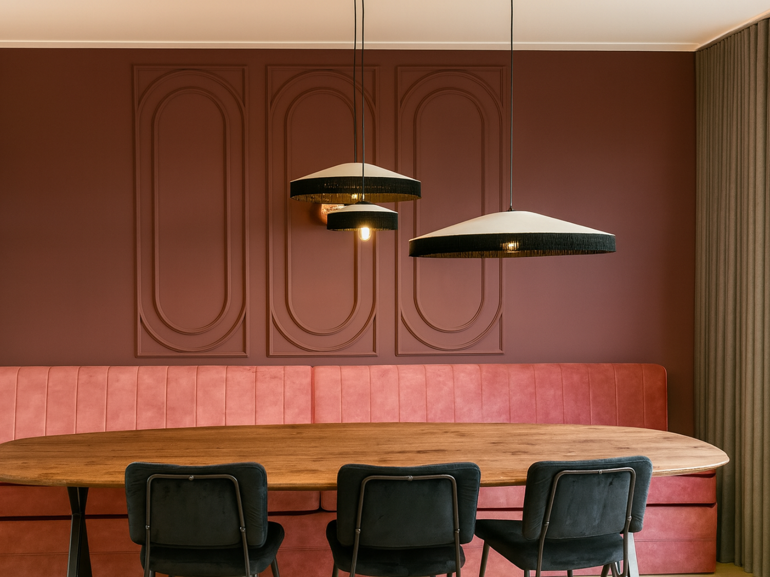 De wand in deze stijlvolle eetkamer is opgebouwd uit elegante, rechthoekige kaders waarin de ronde vormen subtiel zijn geïntegreerd. De strakke lijnen zijn gecreëerd met wandlijst PX103, terwijl de twee afgeronde vormen binnen elk kader zijn gemaakt met de flexibele wandlijst PX103F. Deze combinatie van geometrische precisie en vloeiende rondingen zorgt voor een verfijnd contrast dat de muur tot een echte eyecatcher maakt. De warme kleur van de wand versterkt het luxe karakter van het geheel, terwijl de vormen diepte en dynamiek toevoegen.